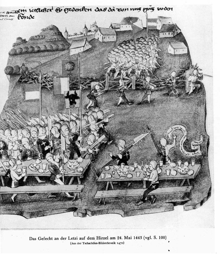 Darstellung aus der Tschachtlan Chronik. Gemäss Chronik Hans Fründ sassen nicht die Innerschweizer am Nachtessen sondern die Zürcher auf der anderen Seite der Letzi. Ausserdem hat Hirzel kein Schloss. Trotzdem ist diese Darstellung wahrscheinlich bekannter als die effektiven Ereignisse.