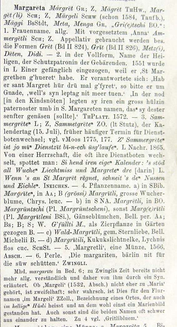 "zu Margaret in www.idiotikon.ch, man beachte insbesondere 'Sammetgrete ... 15. Juli' "